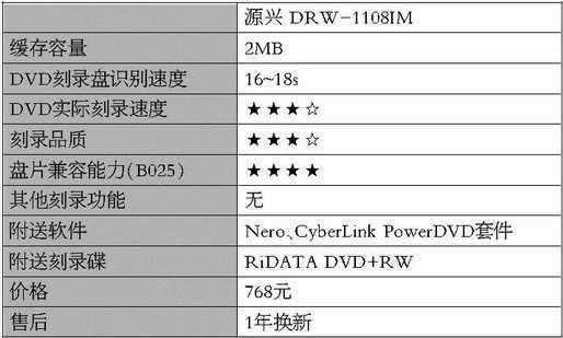 源兴的DRW-1108IM在送测时采用的是B025版固件,在进行盘片兼容测试时,我们发现它相对于B022版固件有一定改进,能够正常识别产品代码/厂商ID为VDSPMSAB 01的盘片了,但对于IS01 001的盘片,识别依旧有问题。
