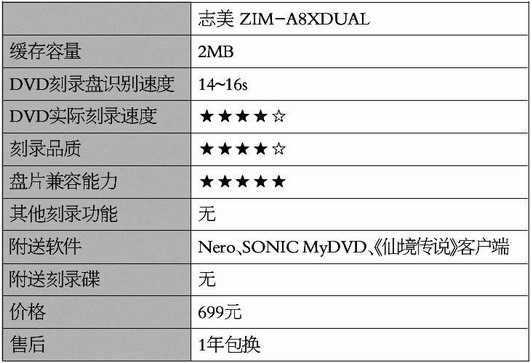 ZIM-A8XDUAL有着出色的盘片兼容能力,支持超容量CD刻录和超速DVD刻录,DVD+R刻录速度非常快,且刻录品质也较出色,而它的价格仅为699元,为此,我们授予它编辑推荐奖。