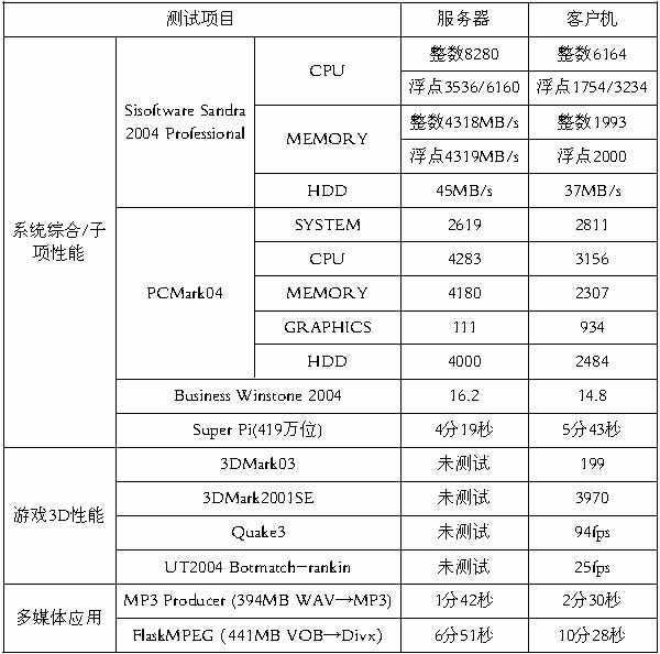 评测数据全面地为我们展示了服务器和客户机各自的性能特色。新蓝网吧服务器在运算和磁盘性能上都有出色表现。作为局域网内的游戏服务器,要求CPU和内存性能出色。也许玩过CS的朋友都有感受,若30人同时进行游戏,服务器的CPU处理速度跟不上会导致游戏时常停顿,不连贯。如果这个服务器同时又要兼做文件服务器,大内存、高速硬盘则更是不可或缺。不过,80GB的硬盘单作游戏服务器也许还够用,但若作为音频、视频服务器,则显得有些吃力了。不少网吧的文件服务器都采用4块硬盘,容量总计在600GB以上。