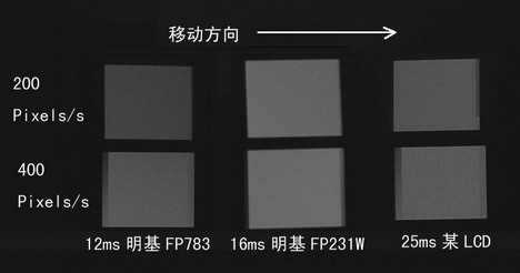 在响应时间指标上,两款显示器可谓遥遥领先。明基FP783的响应时间为12ms,这是市场上响应时间最快的液晶显示器之一,而明基FP231W的响应时间为16ms。我们用索尼F717数码相机,以1/400s的快门拍下了快速掠过屏幕的白色方块。从放大的图片我们可以看出,对于200Pixels/s的运动白色方块,在明基FP783和FP231W上还看不到任何拖影,而另外一款25ms的液晶显示器已经可以看到明显的拖影了。当白色方块的运动速度提高一倍后,3台显示器都出现了拖影。不过这里要提醒的是,这些拖影都是借助数码相机拍摄下来的,实际上人眼是很难看出的,实际使用也证实了这一点。