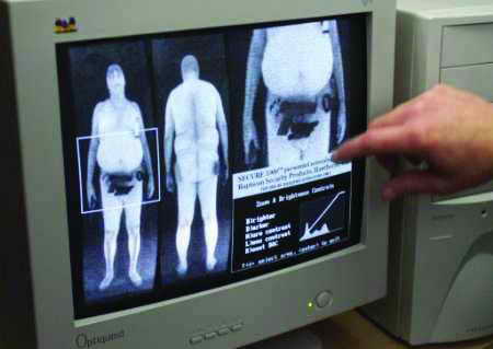 在美国佛罗里达奥兰多机场装备的低能耗全身X光透视仪。我们可以清楚地看到这名男子全身上下的每一寸肌肤,包括内衣中的手枪。