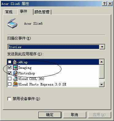 看来只有从软件设置上探探路了,打开“设备管理器”,查看“Acer Slim6”(扫描仪设备)工作正常,估计硬件本身损坏的可能性不大;点击“控制面板”中的“扫描仪和照相机”,可以看到“Acer Slim6”,双击弹出“属性”(如图),这时忽然在“事件”中发现,“扫描仪事件”为Preview(预览)时,“发送到以下应用程序”中没有一项被选中,会不会“机关”在这里?