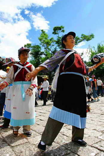 图6《舞》摄于云南丽江四方古城,当时一位身着纳西民族服装的老妇人,领着其他盛装的姐妹及游客在广场上围成圆圈跳舞。通过16mm焦距的镜头,领头大姐显得比后面的人大了许多,而稍微有点变形的肢体,使舞者的动感表现力度得到了放大。