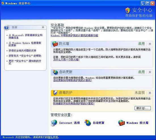 以往我们对网络防火墙、杀毒软件以及在线更新等内容进行设置时需要分别运行不同的程序,而通过SP2中的安全中心就可以集中管理这些内容。