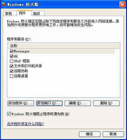 3.进入“例外”标签之后,可以用鼠标勾选允许正常接入Internet的程序。比如我们需要正常使用远程协助程序,只需用鼠标勾选它前面的复选框即可。另外,对于诸如QQ、Foxmail之类的网络程序,还可以点击“添加程序”按钮并且从弹出的程序列表中选择(图2)。其实这一步操作颇有些砍柴之前磨刀的味道,虽然初次使用时要耗费一些时间进行设置,但是经过设置即可避免日后使用网络程序的时候频繁出现网络连接警告的情况。