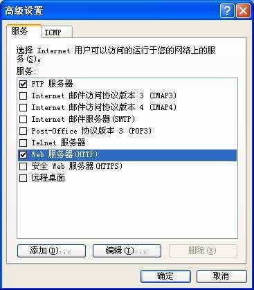 4.如果计算机安装了多块网卡,或者需要开启诸如FTP、Web之类的服务,还可以在“高级”标签下选取相应的网卡,并点击“设置”按钮,即可勾选各种相应的服务和ICMP协议(图4)。