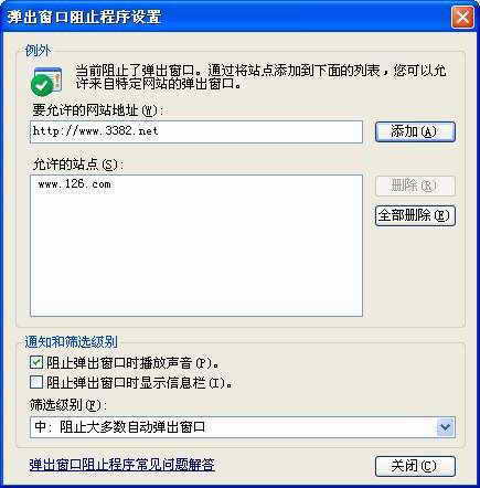 提示:点击信息栏之后选择“设置→更多设置”命令激活弹出窗口阻止程序设置窗口,在此可以事先手工输入允许弹出窗口的网站地址(图5),从而减少后期设置的麻烦。