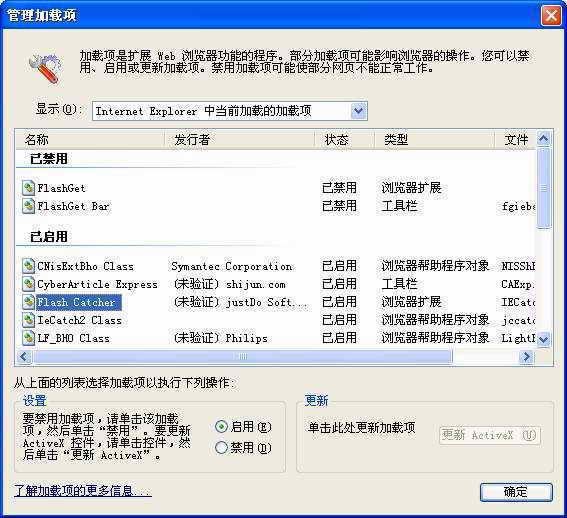 ②比如我们需要对Flash Catcher这个插件进行禁用,只须从列表中选取它,并且点击下部的“禁用”按钮,即可让插件失效(图6)。