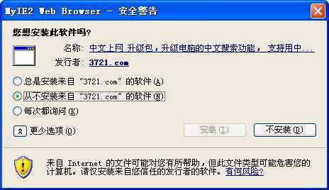 ③以前当我们登录一些网站之后,往往会出现要求安装各种插件的窗口,如果暂时取消这些插件的安装,日后打开网站仍然会有相同的提示。安装了SP2之后就可以对这些插件进行从不安装的选择(图7),不仅能够避免频繁出现的提示窗口,更主要的是阻止了恶意插件自动安装带来的严重后果。