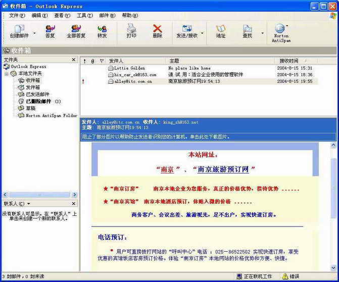 在上期的《解剖史上最强的补丁包》一文中我们已经知道OE现在已经能以纯文本方式显示纯文本邮件,避免恶意代码被无意中执行;同时也加入了禁止从互联网下载图片的功能,以避免将自己的邮件地址透露给垃圾邮件发送者(原理可参看上期文章)。如果邮件中的图片被阻止下载,OE会在邮件正文上部以外部信息条方式给予提示(图8),需要时直接点击即可查看图片了。