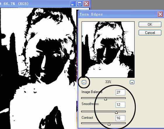 第二步:滤镜的使用。点菜单“Filter(滤镜)→Sketch(轮廓)→Torn Edges(撕边)”。在弹出的控制面板中,点预览窗口左下边的减号按钮,然后调整Image Balance(图像平衡)为“27”、Smoothness(光华)为“12”、Contrast(对比度)为16(图2)。再点“OK”结束。