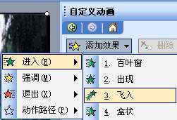 Step2 选中图片,按“自定义动画”任务窗格中的“添加动画”按钮,在随后出现的快捷菜单中,选择“进入、飞入”选项(图4)。并设置“方向”为“自右侧”、“速度”为“慢速”。