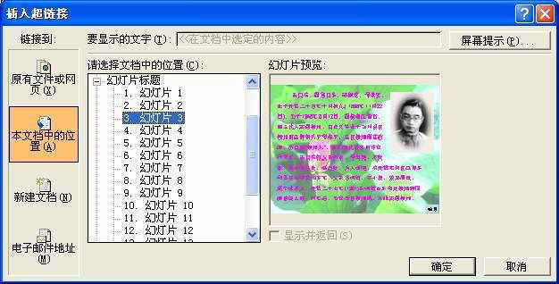Step1 切换到导航幻灯片中,选中某个导航按钮(如“作者简介”等),执行“插入→超链接”命令,打开“插入超链接”对话框(图7),选中左侧的“本文档中的位置”选项,然后选中“幻灯片3”选项,确定返回。