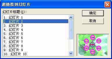 Step2 仿照上述操作,完成其他导航按钮与相应幻灯片的链接工作。切换到相应的幻灯片(如“幻灯片3”)中,执行“幻灯片放映→动作按钮→自定义”命令,然后在幻灯片中拖拉出一个按钮来,此时系统会弹出一个对话框,选中“超链接到”选项,并按右侧的下拉按钮,选择“幻灯片”选项,打开“超链接到幻灯片”对话框(图8),选中“幻灯片2”(导航幻灯片),确定返回。