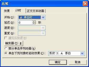 Step2 选中第一个备选项的提示文本框,为它添加“出现”动画,然后双击任务窗格“文本框”动画右侧的“时钟”图标,展开“空翻”对话框,切换到“计时”标签下,单击“触发器”按钮,选中“单击下列对象时启动效果”选项,并按其右侧的下拉按钮,选择“形状3A、李白”选项(图10),确定返回。