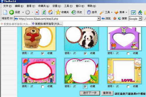 在页面中的模板列表中,将需要的模板下的“收藏”一项打上钩。注意一次最多只能选8个模板,收藏的模板可以用于以后拍照。然后点页面下方的“进行下一步”按钮(图2)。