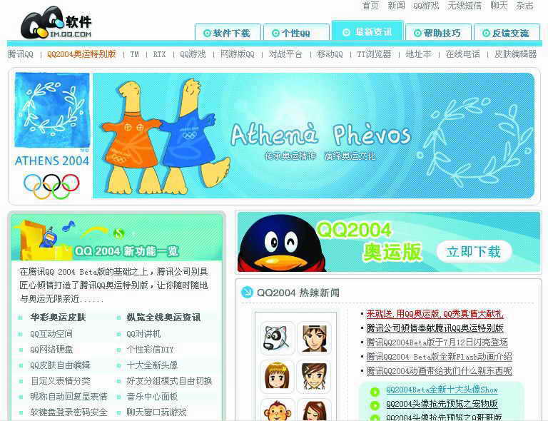 腾讯QQ推出了奥运特别版(http://im.qq.com/a/040412),在这个版本里,QQ换上了华彩炫丽的奥运皮肤喜迎奥运。奥运五环、象征和平的橄榄枝、可爱的雅典娜和费沃斯兄妹遥相呼应,展现出永远的奥运精神。