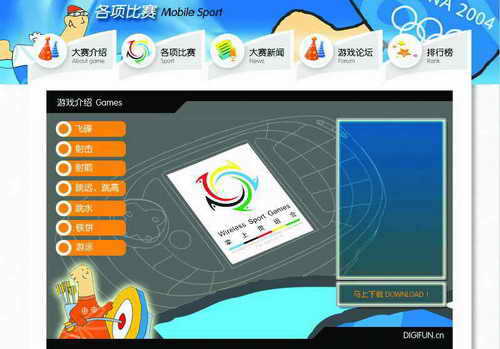 移动梦网在雅典奥运会期间推出了奥运烽火系列活动,众SP各展所长,纷纷推出了众多奥运主题的手机服务。有奥运即时新闻、有奖竞猜游戏、铃声下载、屏幕下载、互动游戏等。下面推荐的这个网址,http://aoyun.uen.cn上就有很多好玩的奥运主题游戏,不过不要太着迷,免得下月的手机账单让你欲哭无泪。
