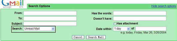 怎样才能在一大堆的邮件中找到未阅读的邮件呢?只要你打开网页上的“Search Option”高级搜索界面,然后在“Search”字符旁边的下拉条中选择“Unread Mail”,点击“Search Mail”就可以列出全部未阅读的邮件了(如图1)。