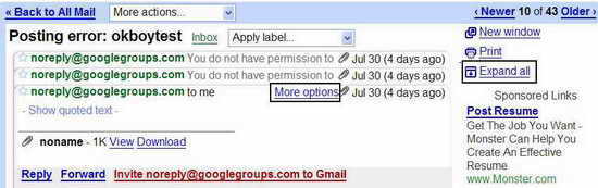所谓的“会话主题”是指Gmail会把某些关联的邮件(例如就讨论某件事情而不断往来的所有邮件)自动归类保存在一起,这样看起来条理更清晰,查找起来也十分方便。但是按常规方法删除邮件会把整个会话主题中的全部邮件删除,而要删除某个会话主题下面的一封邮件就需要一定的技巧:首先打开这个会话主题,点击网页右边的“Expand all”链接展开所有邮件(如图2),然后找出需要删除的邮件,再点击邮件旁边的“More options”显示功能菜单,最后选择“Trash this messenger”就可以了,其余的邮件也不会受到什么影响。