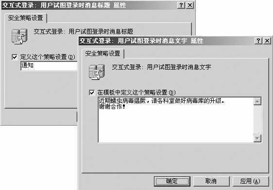 选中“news”项,点击窗口下方的“向上”按钮,将该组策略对象的执行优先权调高。接着点击“编辑”按钮,在打开的窗口中依次展开“计算机配置→Windows设置→安全设置→本地策略→安全选项”,在右侧列表中找到“交互式登录:用户试图登录时消息标题”并双击打开。在“交互式登录:用户试图登录时消息标题 属性”窗口中勾选“定义这个策略设置”复选框,然后输入标题内容(如“通知”),最后点击“确定”按钮。双击“交互式登录:用户试图登录时消息文字”项,选中“在模板中定义这个策略设置”,在下方的文本框中输入要发布的通知内容后点击“确定”按钮即可(图2)。