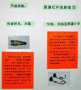 作品介绍:在我们学校的“机器人”小组活动中,发现LEGO红外发射仪的导线非常容易被损坏。而重新购买一套LEGO红外发射仪要花费350元钱。可红外发射器本身并没有损坏,只是导线损坏而已,这样就去重新买一套新的LEGO红外发射仪,实在太浪费。能不能用其他的线来代替LEGO红外发射仪的原装导线呢?经研究,发现可以用普通的串口线来替代它。但串口线的接口与红外发射器的接口并不相同,因此,我们研制了可以把普通串口转换为红外发射器接口的“简易红外发射接口”。有了它,就可以把普通串口线作为原装LEGO红外发射仪导线来用了。改装成本只要3.5元,占原装成本的1%,经济实用。