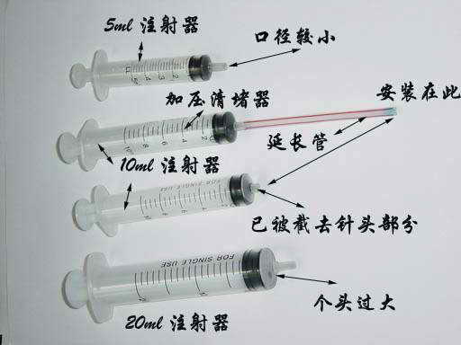 第二步:把延长管无针管部分的另一头,插入新的注射器的针管插头处。一支带有延长管的清堵器就完成了(图1中的第二个针管即为成品)。
