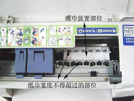 3.把准备好的纸巾,根据所使用打印机的具体情况,折叠成2厘米宽、长度大于10厘米、厚度4~6层的长方形纸条。将折叠好的纸条平铺在打印机更换墨盒位置下面的浅槽内(注意:不同型号的打印机,其内部的浅槽宽度各不相同。总之,纸条的宽度不能大于浅槽的宽度,厚度不能高于浅槽的深度,否则会阻塞打印车架的移动,见图2)。