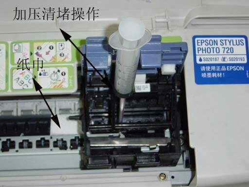 对于绝大多数用户而言,只要喷嘴插管内还有墨水,就可以很快地进行喷嘴的清堵工作。流程为:打印机开机→转换至换墨盒状态→打印机断电→加纸巾→取下墨盒→空气加压清堵→取出纸巾→清洁机身→安装墨盒→完成清堵操作。几分钟就可以搞定。