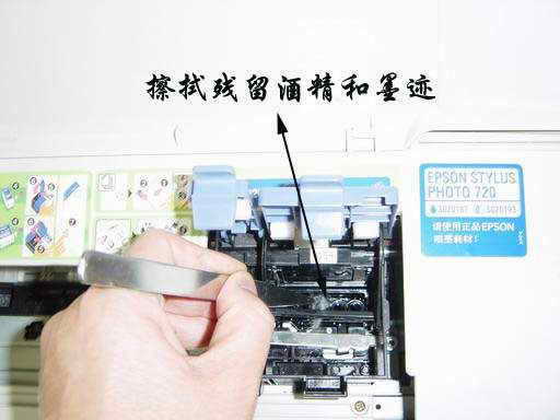 6.用无水酒精清洗完成后,要用药棉或纸巾,吸去残留在打印头插管底座上的酒精和浅槽位置上渗出的墨迹(见图6)。