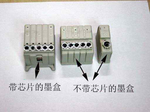 对于带有芯片的EPSON墨盒(见图7),最好是在打印机提示墨尽需要换新墨盒时进行清堵。否则新墨盒换上后,打印机只能使用旧墨盒的剩余墨水量(对于EPSON旧墨盒的重复使用,限于篇幅本文就不再赘述了)。另外,用户在操作时可能会发现,不用延长管,直接用注射器,也可以完全插入部分喷嘴插管处。在这里笔者郑重地提醒大家,若直接使用注射器,由于有墨盒压盖和其他部件的限制,注射器很有可能不能垂直插到喷嘴插管上。这样,操作时就容易造成喷嘴插管歪斜,从而影响独立打印头的使用寿命。