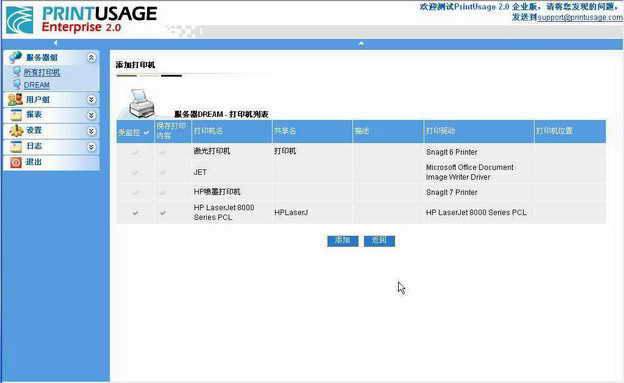 登录成功后,在管理界面中单击“服务器组→所有打印机”,然后再单击“添加”按钮,在打开的添加页面中选择需要监控的打印机(图1)。