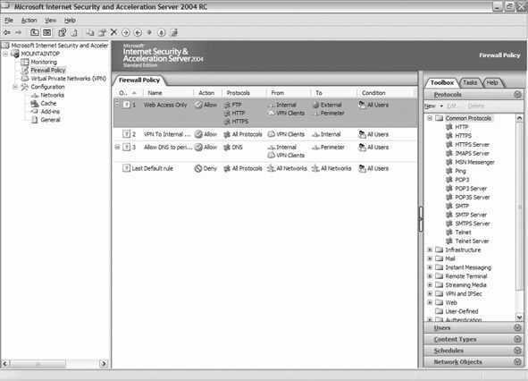 ISA Server的最新版本是2004,第一代产品的推出是数年前的事了,官方的介绍是“ISA Server 2004 为各种类型的网络提供了易用性和快速、安全的访问。它尤其适合于保护微软自己的应用程序(如Microsoft Outlook Web Access (OWA)、Microsoft Internet信息服务、Office SharePoint Portal Server、路由和远程访问服务、Active Directory目录服务等)的网络应用。”