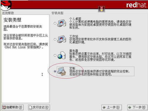 选择“定制”选项,接着选择“用Disk Druid手工分区”(图2)。
