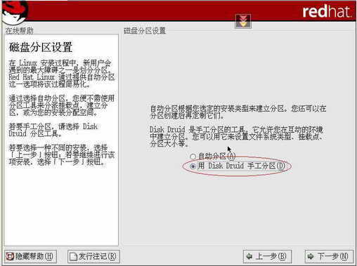 在Linux安装中,新用户碰到的最大问题就是如何分区。在Red Hat9.0的安装界面中,提供了两种分区方式。自动分区是系统根据用户选择的安装类型进行空间分配。这里我们要安装多系统,必须自己分区,选择“用Disk Druid手工分区”。
