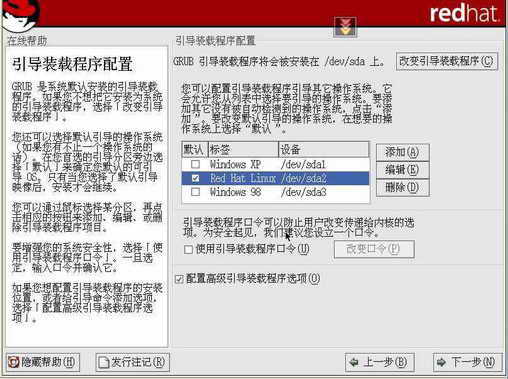 图4是Red Hat Linux的系统引导程序配置图。从中可以看到Linux引导管理程序默认引导Linux。如果是在多重操作系统进行配置中,我们可以在这里修改,在Windows XP前面的复选框打上钩。这样系统默认启动时就会自动选择WindowsXP。