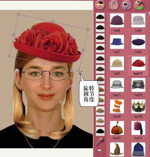 发型选好了,再选一个礼帽试试,点击工具栏上的“帽子”工具,这里有非常多的样式供你选择,方法与换发型一样,对礼帽的角度你还可进行一定的调整。此外你还可以给自己加一副眼镜显得更斯文,呵呵…效果见图2所示。
