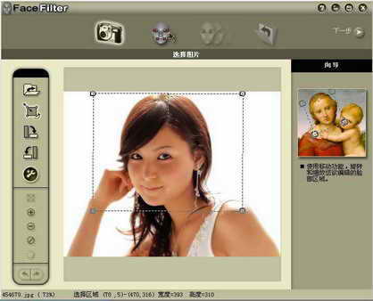 1.在FaceFilter软件中打开图片,然后拉出脸部的范围,如有点歪斜,你可将拉取的方框旋转如图6所示,然后点下一步。