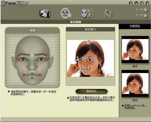 2.在弹出的界面中,按照左边的向导提示对脸部建立几个重要的节点(图7),然后点“下一步”。