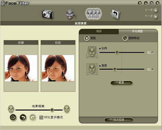 4.在右边点“手动调整”,你就还可以对脸部形状做一定透视和进行胖瘦调整(图8)。一切满意后,再点“下一步”,这时显示的照片便是修改后的照片,单击“另存为”即可将制作好的照片保存起来了。
