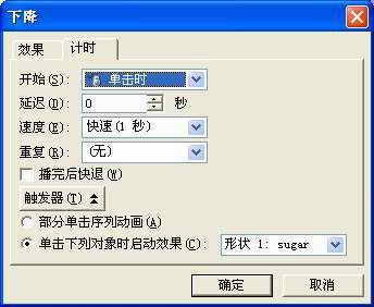 Step1 选中音标图片并右击鼠标,在随后弹出的菜单中选择“自定义动画”选项,展开“自定义动画”任务窗格,添加一种动画(如“下降”),然后双击任务窗格右侧的“时钟”图标,展开“下降”对话框(图3),切换到“计时”标签下,单击“触发器”按钮,选中“单击下列对象时启动效果”选项,并按其右侧的下拉按钮,选择“形状1、sugar”选项,确定返回。
