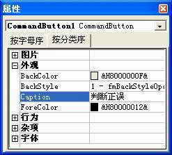 Step2 点击工具箱上的“命令”按钮,然后在幻灯片中拖拉出一个命令按钮来,选中此按钮,按一下工具箱上的“属性”按钮,打开“属性”对话框(图6),切换到“按分类序”标签下,展开“外观”选项,将“Caption”选项后面的字符修改为“判断正误”(或其他字符),关闭窗口。然后调整好按钮的大小,并将它定位在幻灯片的合适位置上。