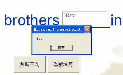 经过设置后,该幻灯片在播放时,在文本框中填写上一个单词,然后按“判断正误”按钮,如果正确,则显示出一个“Yes”对话框(图7),如果不正确,则会显示出一个“No”的对话框;如果按一下“重新填写”按钮,则清除文本框中的字符,让学生重新填写。