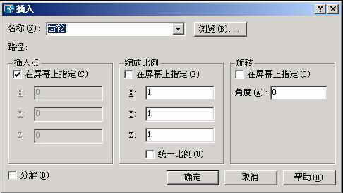 5.当使用新建模板Axadiso.dwt绘制图形时,如需用到保存在模板文件中的常用图形时,就点击工具条上的“插入块”或在命令(COMMAND)行中输入INSERT命令,回车,就可以按需要的插入点、缩放比例、旋转角度很方便地将图块插入。