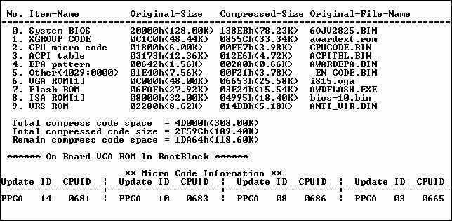 “CPU micro code”表示CPU微代码,是用来兼容各种型号CPU的;“ACPI table”是高级电源管理程序,计算机启动后驻留内存,并监控计算机的工作;“Flash ROM”是BIOS中内置的刷新程序;“VGA ROM”是集成显卡的BIOS驱动程序;“VRS ROM”代表病毒检测程序,防止病毒改写硬盘主分区表和系统引导区。