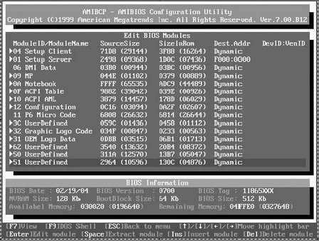 阿萌:查看AMI BIOS模块就要用AMIBCP.EXE工具了。用AMIBCP.EXE程序打开一个AMI BIOS文件,然后在主界面中选择“Edit BIOS Modules”项,就可以看到BIOS中的各个模块了(如图2)。其中,“OEM Logo Data”就是AMI BIOS中的EPA标志图像文件,“Setup Server”代表AMI BIOS设置服务器端,“Setup Client” 提供AMI BIOS设置画面的接口程序,“DMI Data”代表数据区,“ACPI Table”表示ACPI规范控制表格区,“INIT”表示从Reset跳入点开始的Boot Block程序代码,“POST”表示POST程序代码,“Runtime”代表BIOS功能函数/常驻的程序代码,“Configuration”代表系统组态显示模块,“Graphic Logo Code”代表OEM全屏幕画面处理程序,“Graphic Logo Data”是OEM全屏幕图形文件数据模块。