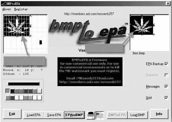 运行BMPtoEPA后,点击“Load BMP”按钮,读取刚才设计好的BMP文件(如果文件大小或色彩不合适,BMPtoEPA软件就会提示出错并拒绝执行命令),然后点击“BMPtoEPA”按钮,在窗口左边就会出现转换好的EPA图案(如图3)。由于刚才我们制作的是黑白两色的BMP文件,所以转换后的EPA图案也只有两种颜色,但在该软件中我们可以对图案进行16色的着色,修改后可命名保存(这里假设为BIOS.EPA)。