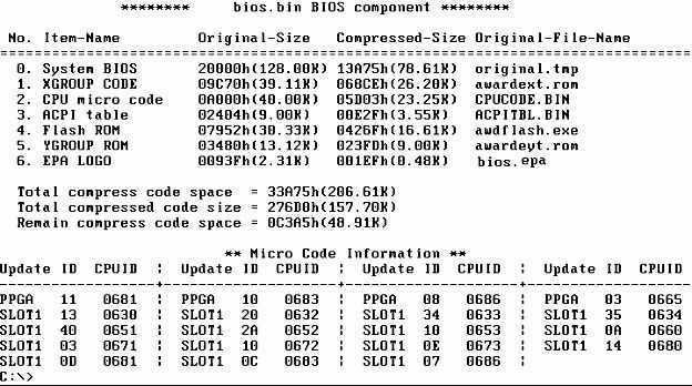 阿萌:很简单,你只要在DOS状态下运行“CBROM BIOS.BIN /EPA BIOS.EPA”命令,CBROM就会把制作好的EPA文件压缩后自动写入BIOS文件中。完成后我们再用CBROM查看BIOS文件,你会发现原来的那个EPA文件已经被替换了(如图4)。