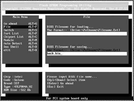 阿萌:同样先备份AMI BIOS。运行AMI BIOS刷新工具Amiflash.exe,将光标移至“File”选项按回车键,然后填好备份栏中的BIOS文件名,再按回车键即可备份成功(如图7)。