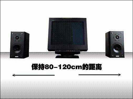 2.0音箱由于功率较大,能够营造较大的声场,因此建议将两只音箱离开一定距离,80~120cm为好(图1),音箱前方后方都不要堆放体积较大物体,像CD盒这样容易振动的东西最好远离2.0音箱,CD盒振动时也会产生轻微的噪声。有些不平整的桌面可能难以摆稳2.0音箱,建议使用软胶垫高音箱,达到平稳摆放的目的。